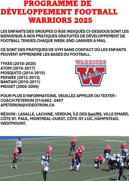 Un camp de jour de football sans contact sera disponible du 3 juillet au 8 août. Pour plus d'informations clicker ici. Ou contacter A. Peterkin (514)862-2407